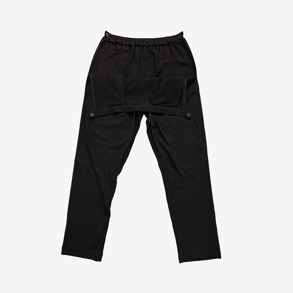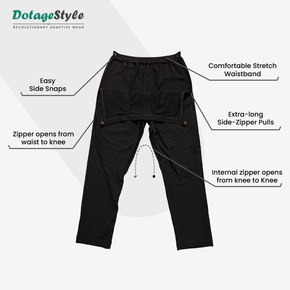 - Center Inseam Opening (Knee to Knee): A discreet front opening along the inseam from knee to knee allows improved access for catheter management, medical exams, and seated comfort.